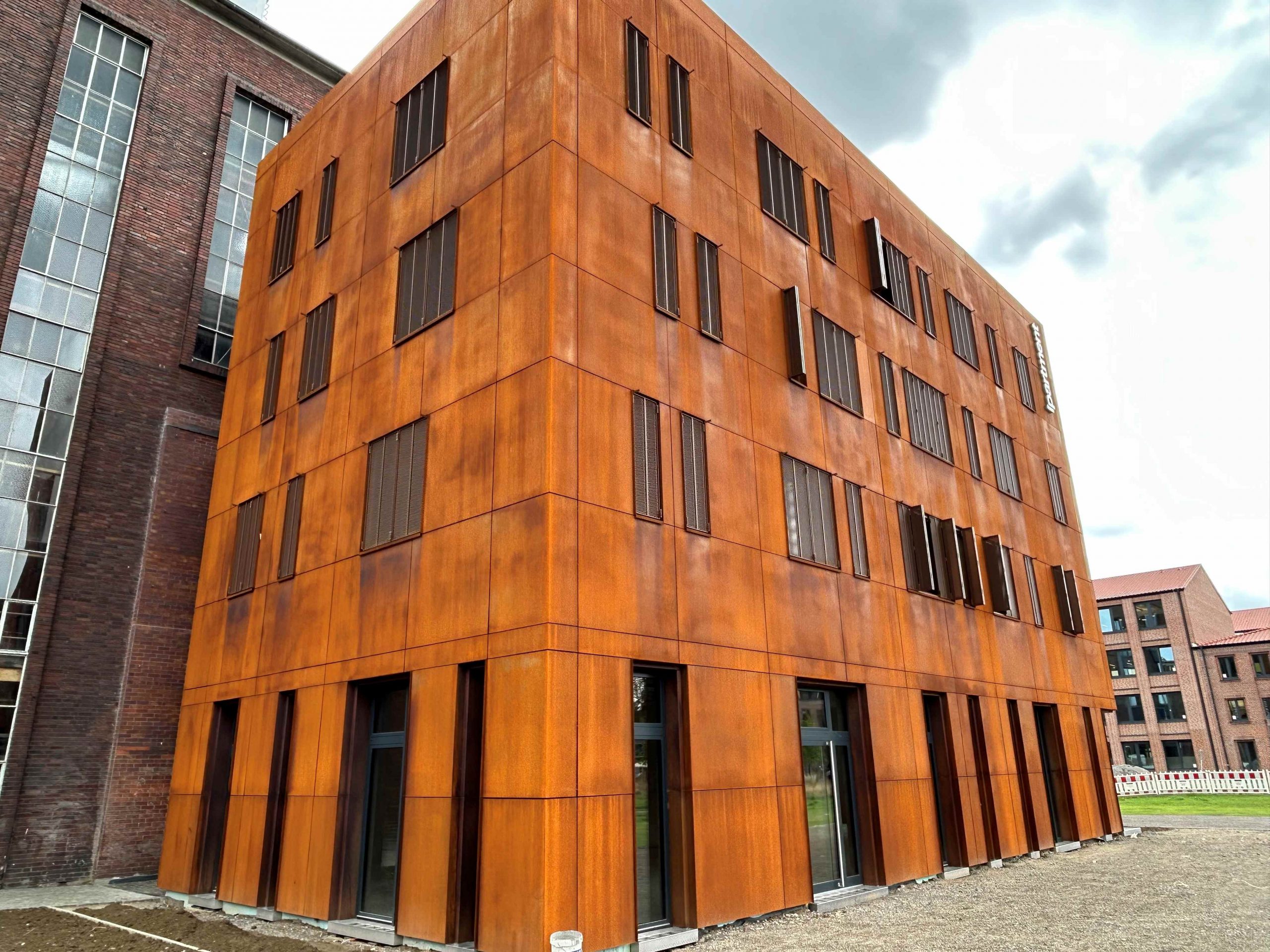 Le choix des matériaux a été arrêté en concertation étroite avec les autorités patrimoniales. Pour Bernd Oxen, l’acier Corten évoque visuellement la dégradation, et « c’est justement cette patine rouillée qui protège durablement la façade et incarne la conservation. »