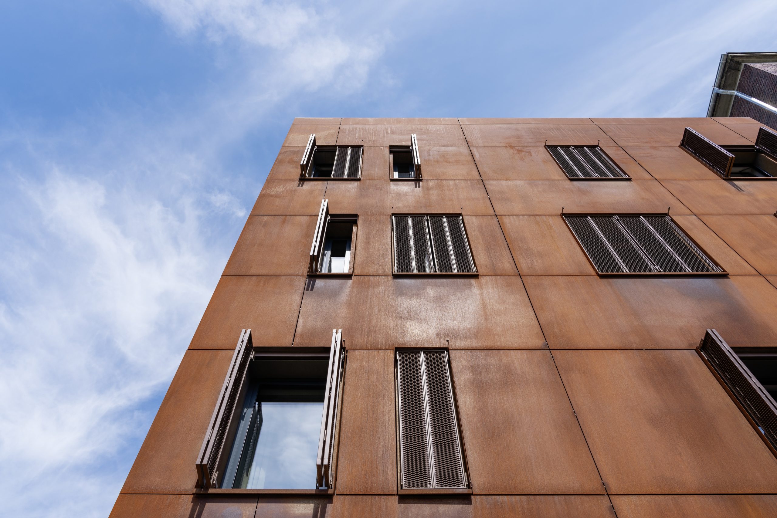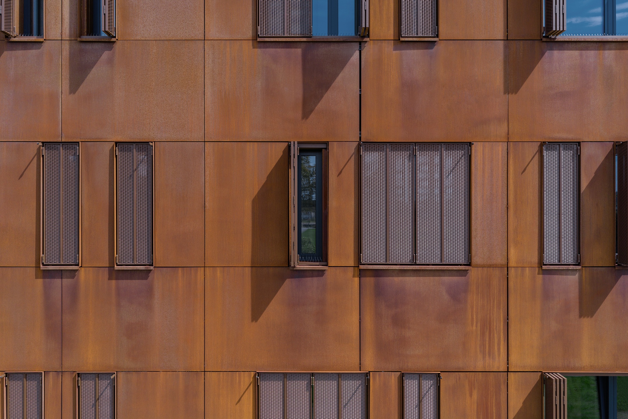 En complément du parement Corten, les volets coulissants pliants EHRET en métal déployé structurent l’expression de l’enveloppe. Éléments mobiles, ils confèrent à la façade une variabilité d’aspect selon l’usage et l’heure. D’autres solutions ont été étudiées, mais les volets coulissants pliants se sont imposés « car ils traduisent le mieux cette dynamique ».