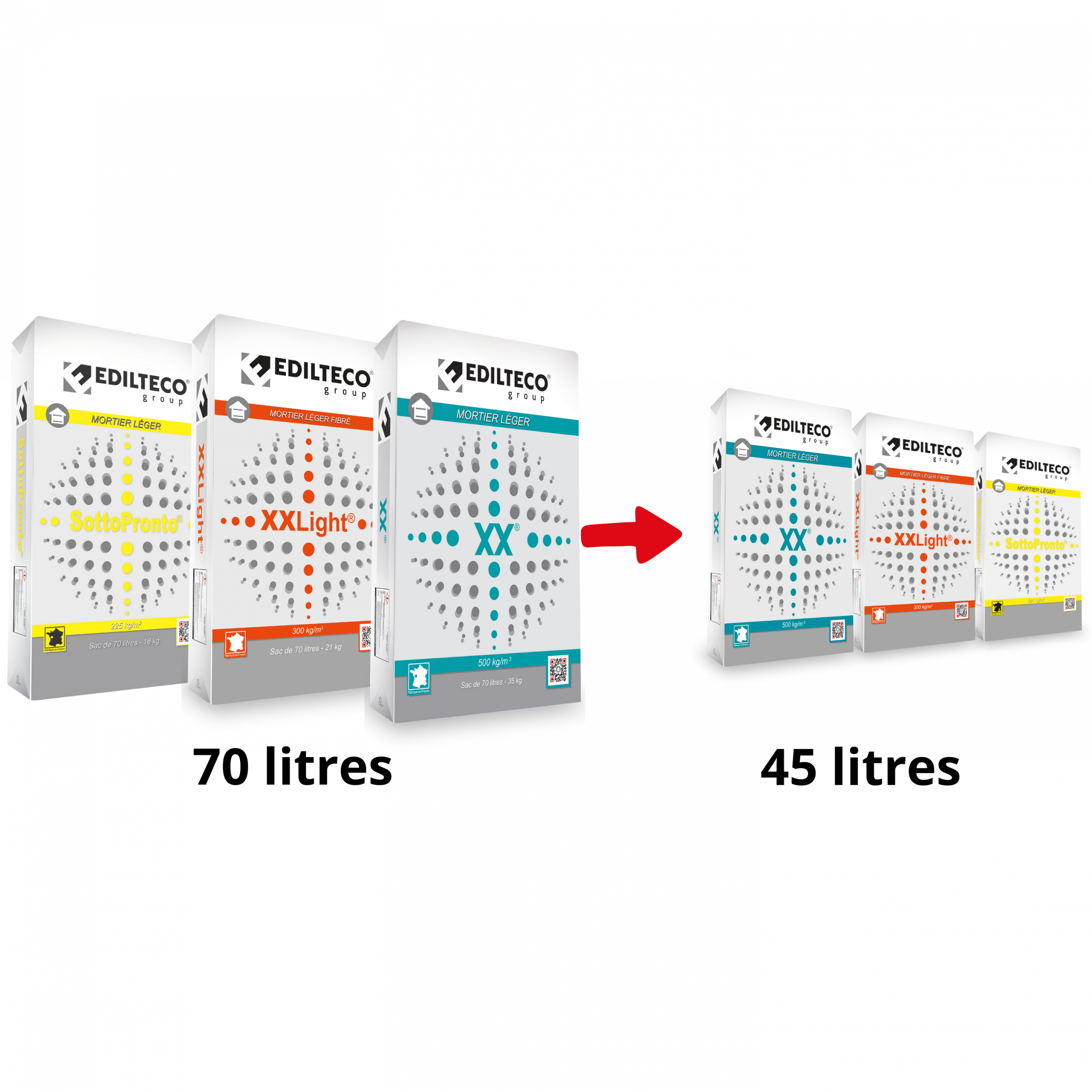 Ainsi, au sein de la gamme de mortiers et chapes légères Prêt à l’Emploi, les mortiers légers XX®, XXLight®, SottoPronto® et PLUS®, ont vu la taille de leur conditionnement évoluer : les sacs passent désormais de 70 litres à 45 litres. Ce changement, conçu